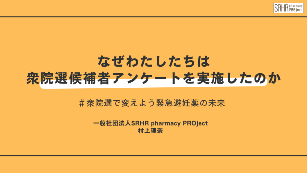 当団体が衆院選候補者アンケートを実施した経緯について説明します。 2024年9月26日、「緊急避妊薬の適正販売に係る環境整備のための調査事業」(以下、調査事業)について、全国で販売を行う薬局を増やすことが一般に公表されま … 続きを読む なぜわたしたちは衆院選候補者へのアンケートを実施したのか